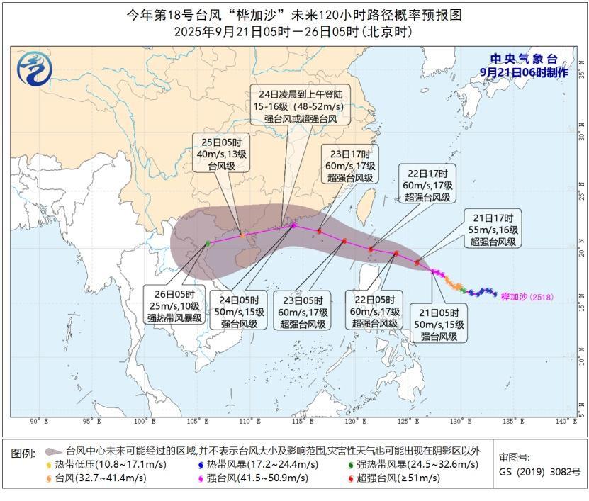 广东省气象台9月20日预计,“桦加沙”将在22日夜间穿过巴士海峡进入南海海域,届时强度可达超强台风级, 23日起“桦加沙”将自东向西严重影响广东海面及陆地,并可能于24日至25日在广东省中西部到海南岛东部沿海地区登陆。
